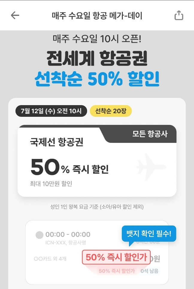 매주 수요일 오전 10시에 열리는 국제선 항공권 반값 이벤트를 통해 선착순 20명에 들게 되면