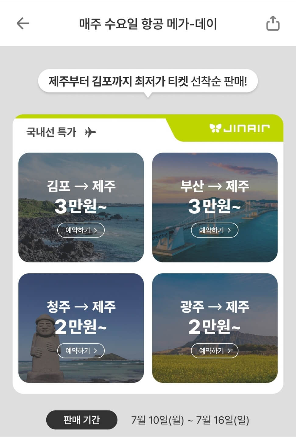 위 사진에서 볼 수 있듯, 매주 만나볼 수 있는 즉시 할인가 노선을 통해 미국과 동남아를 비롯한 모든 국제선 노선의 특가 할인 항공권과 제주도행 비행기 표를 포함한 국내선 항공권까지 할인된 가격으로 만나볼 수도 있습니다.