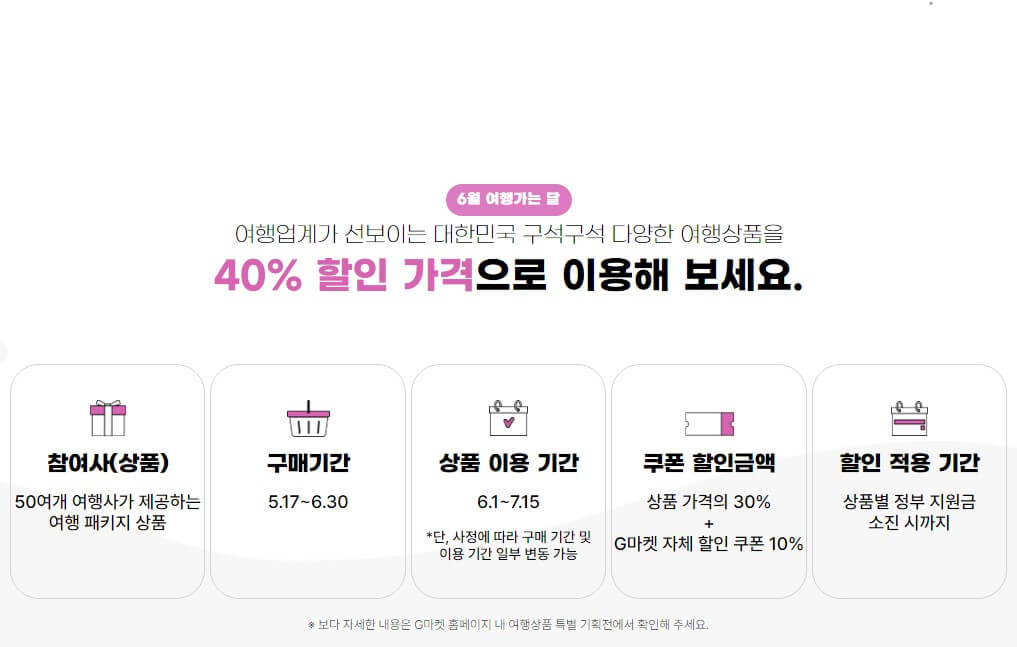 해당 이벤트 혜택은 오직 G마켓에서만 누릴 수있으며, 쿠폰은 ID당 2개까지 받을 수 있으니 이번 기회에 받아놓고 여름 휴가 때까지 저렴한 비용으로 국내 패키지여행을 다녀올 수 있는 아주 좋은 기회라고 생각됩니다.